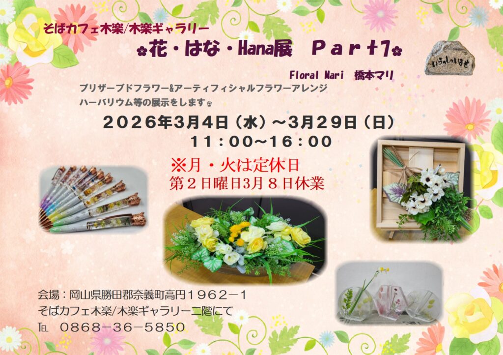 木楽ギャラリー2F、2026年3月の企画展は、『花・はな・Hana展 Part7』です。