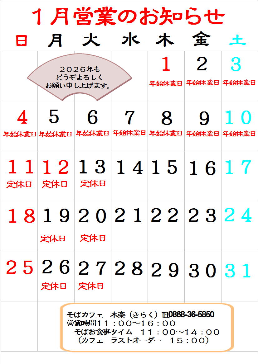 ~そばカフェ木楽 2025年12月営業日のお知らせ~