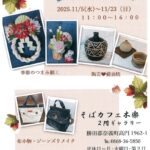 2025年10月15日 / 最終更新日 : 2025年10月15日 sobacafe イベント 木楽ギャラリー 11月は 『ごきげんさんの手仕事三人展』 木楽ギャラリー2F、2025年11月の企画展は、『ごきげんさんの手仕事三人展』です。ちえちゃん工房(岡山県津山市)の三名による、手作り作品展。ちりめんつまみ細工・陶器・ジーンズリメイクの布小物などなど、3人の個性が光る楽 […]